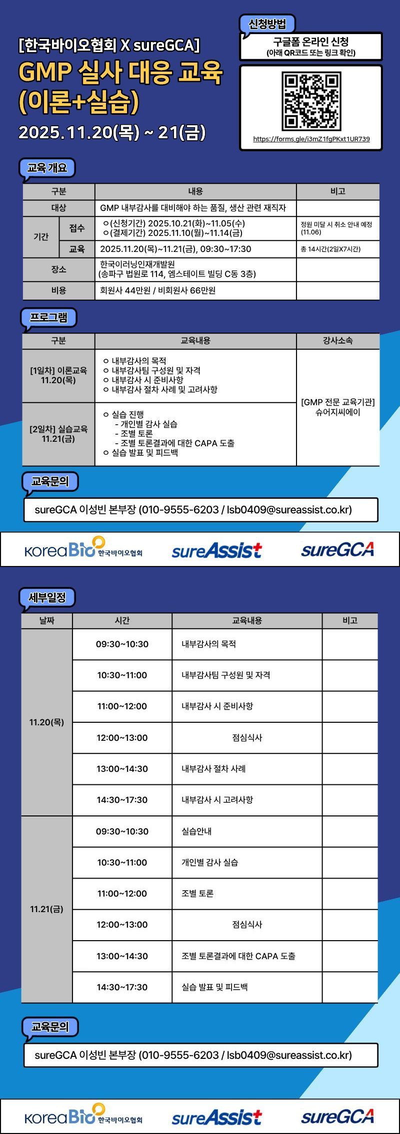 ■ 교 육 명 : GMP 실사 대응 교육■ 교육일정 : 2025년 11월 20일(목) ~ 11월 21일(금)■ 참석대상 : GMP 내부실사를 대비해야 하는 품질, 생산 관련 재직자■ 신청방법 : 온라인 접수 (구글폼 참가신청서 제출)■ 문의처: sureGCA 이성빈 본부장/ 010-9555-6203, lsb0409@sureassist.co.kr