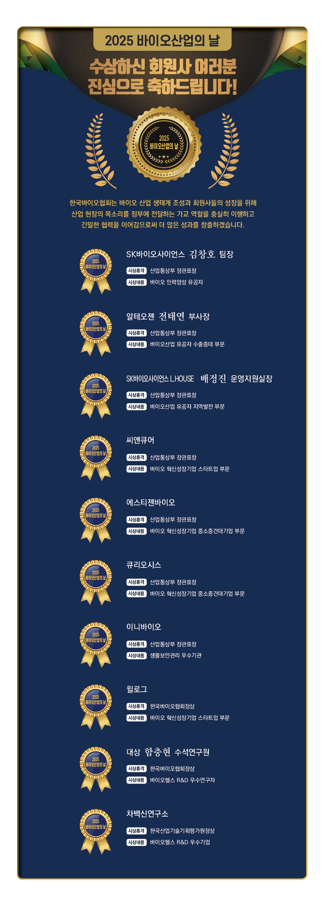‘ 2025 바이오산업의 날 ’ 수상 하신 회원사 여러분 진심으로 축하드립니다.