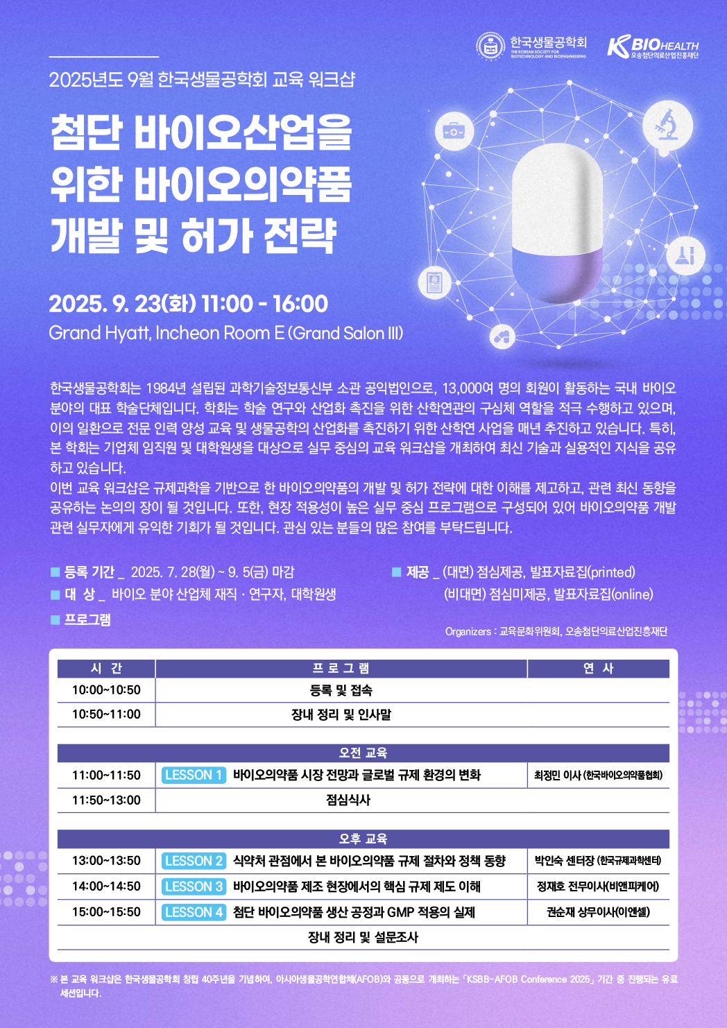 이번 워크샵은 규제과학을 기반으로 한 바이오의약품의 개발 및 허가 전략에 대한 이해를 제고하고, 관련 최신 동향을 공유하는 논의의 장이 될 것입니다.
