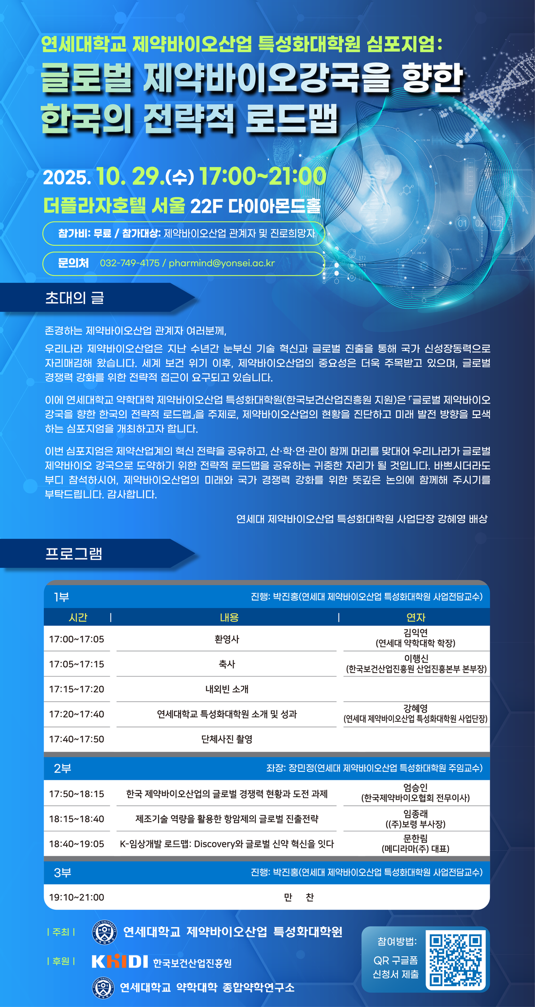 연세대학교에서 10월 29일(수) 「2025 연세대학교 제약바이오산업 특성화대학원 심포지엄」 을 개최합니다.