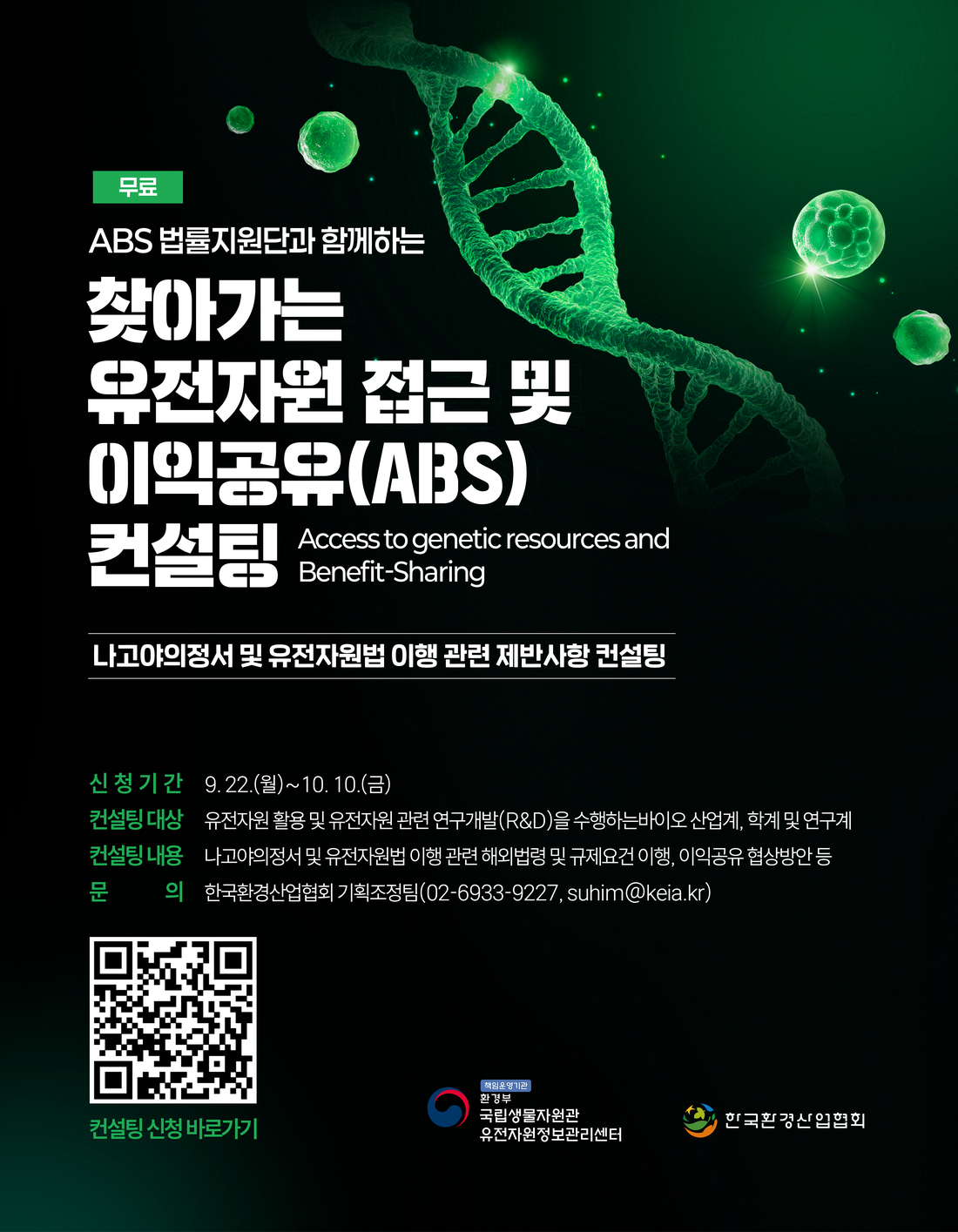 한국환경산업협회에서 「찾아가는 유전자원 접근 및 이익공유(ABS) 무료 컨설팅」 을 진행합니다.