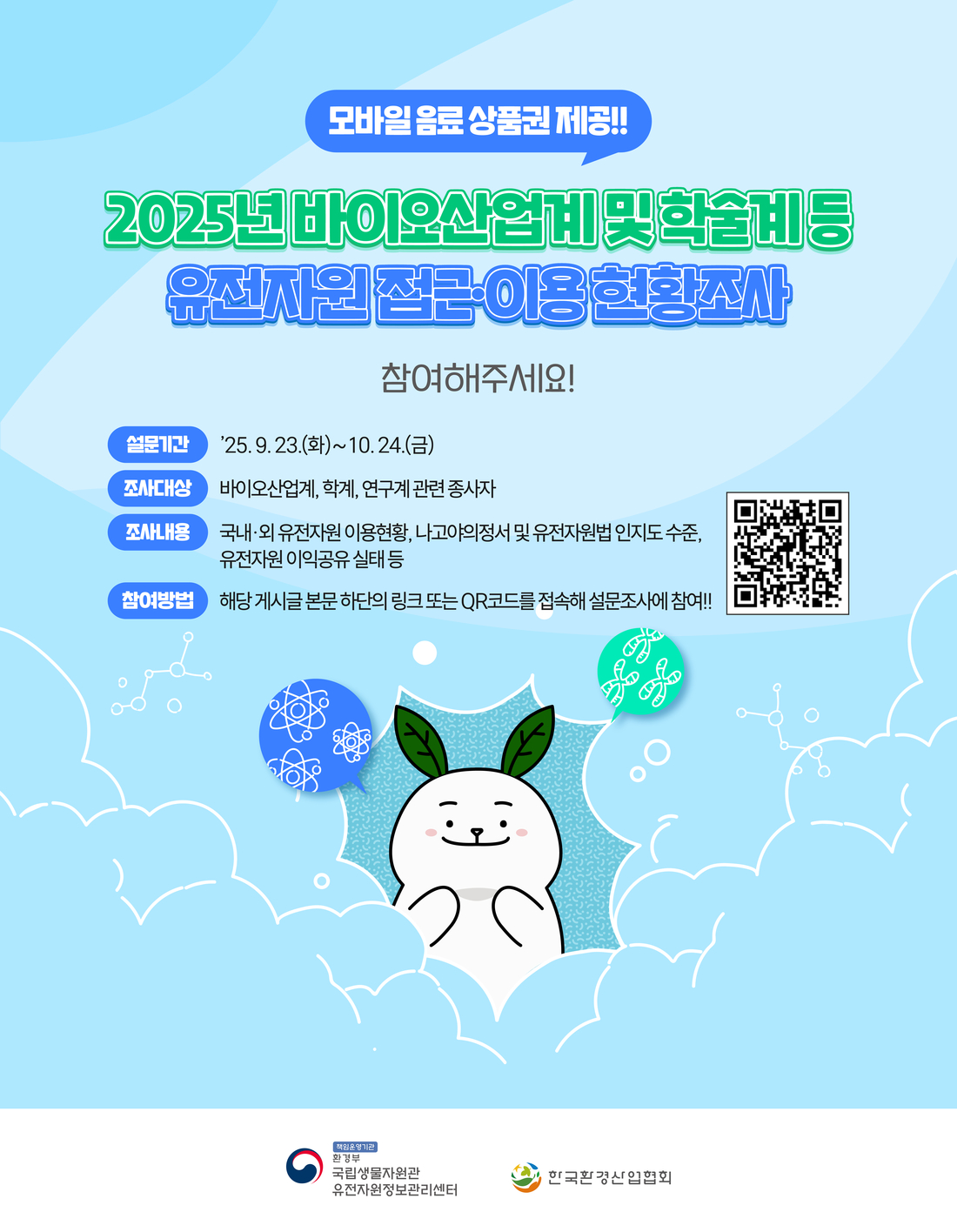 한국환경산업협회에서 「바이오산업계 및 학술계 등 유전자원 접근·이용 현황조사」 를 진행합니다.
