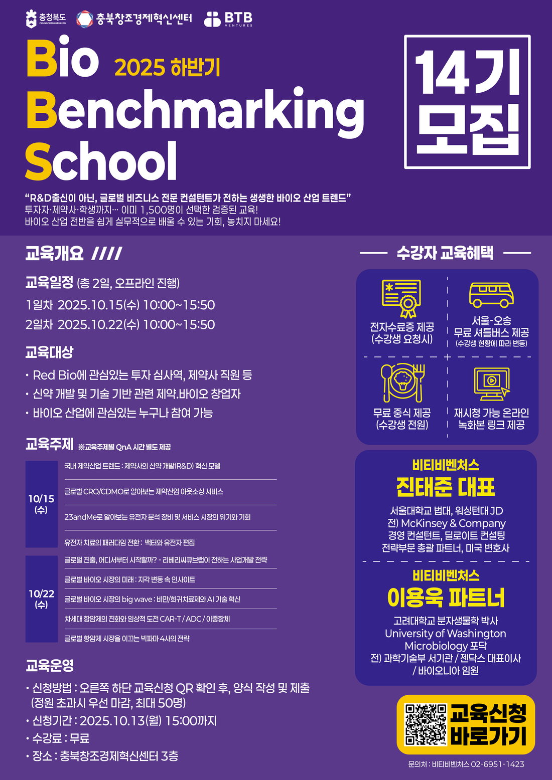 충북창조경제혁신센터 액셀러레이팅실에서 2025년 바이오벤치마킹스쿨(BBS) 하반기 14기 수강자를 모집합니다.