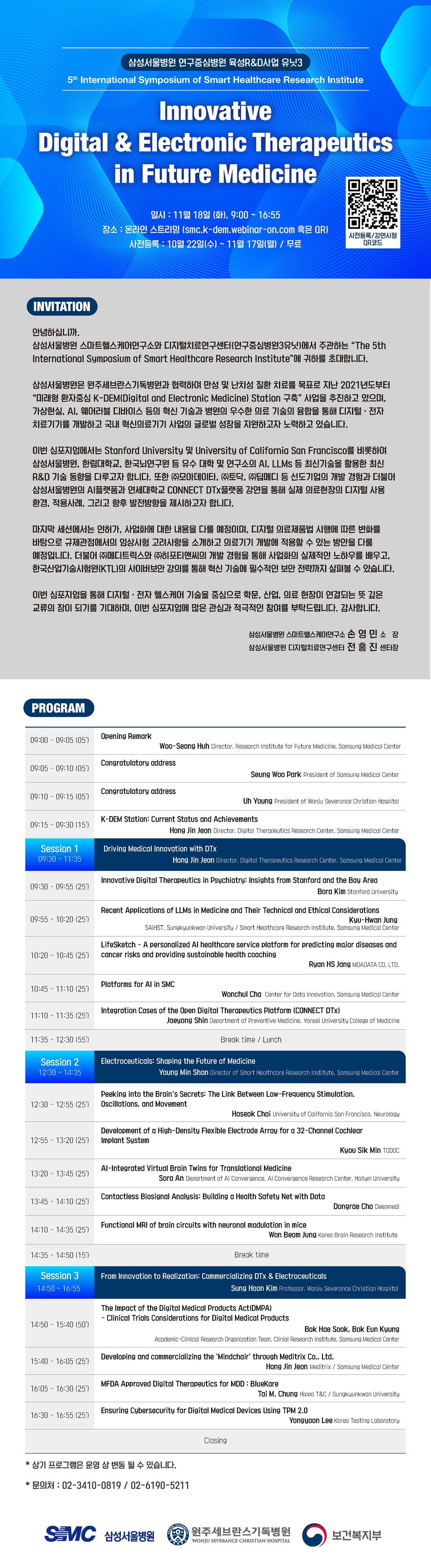 오는 11/18(화) Innovative Digital & Electronic Therapeutics in future medicine 라는 주제로 제 5회 국제 심포지엄을 개최합니다.