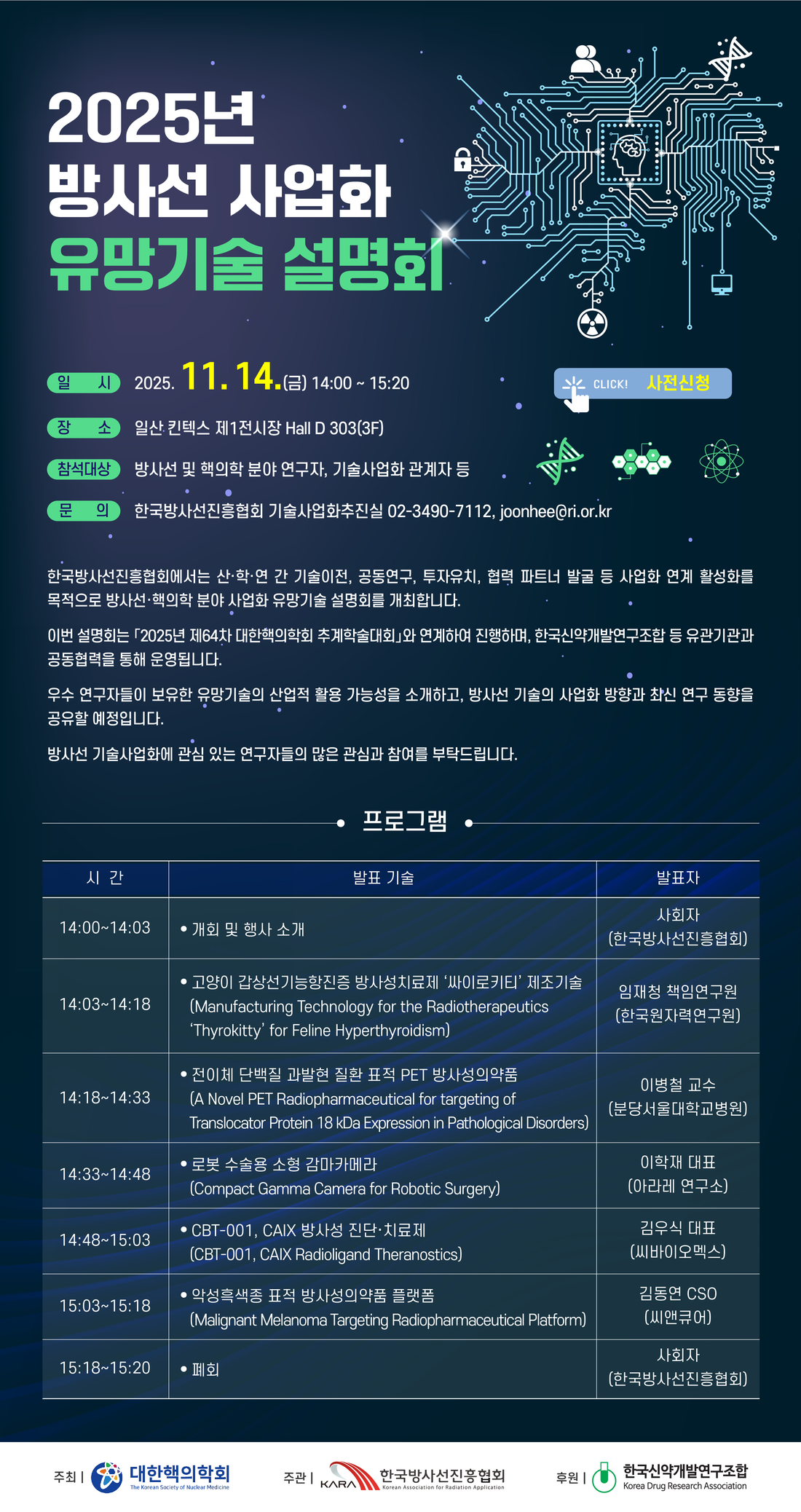 한국방사선진흥협회에서 오는 11월 14일(금), 일산 킨텍스에서 '방사선 및 핵의학 분야 사업화 유망기술 설명회'를 개최합니다.