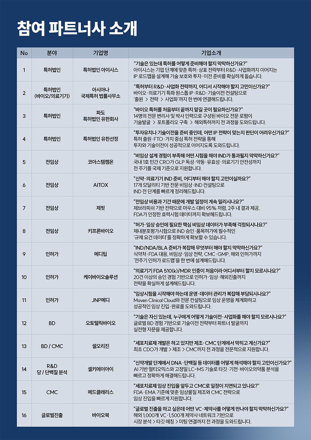 비임상·임상·인허가·특허·BD·글로벌 등 각 분야의 전문 파트너사와 직접 상담할 수 있는 기회입니다.