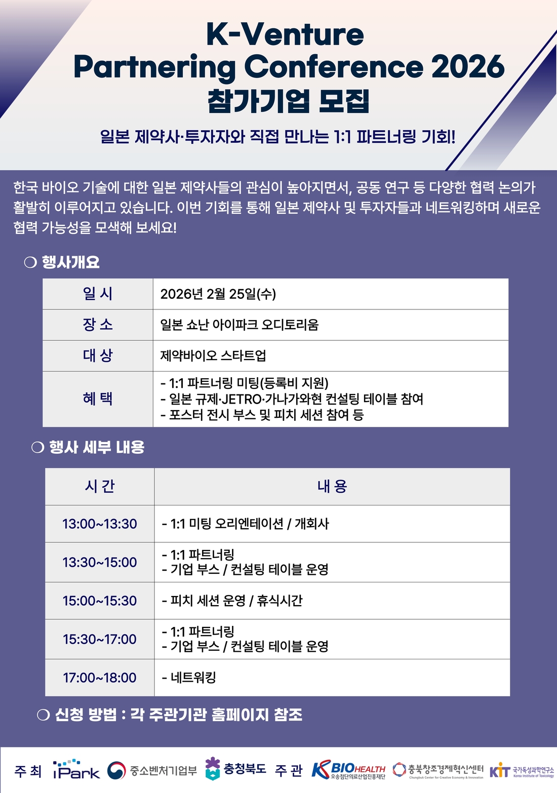 쇼난 아이파크에서 바이오 기업 대상 파트너십 행사 'K-Venture Partnering Conference'를 진행합니다.