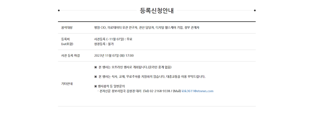 ○ 참석대상 : 병원 CIO, 정부 관계자, 의료데이터 연구자, 디지털 헬스케어 기업, 전산 담당자