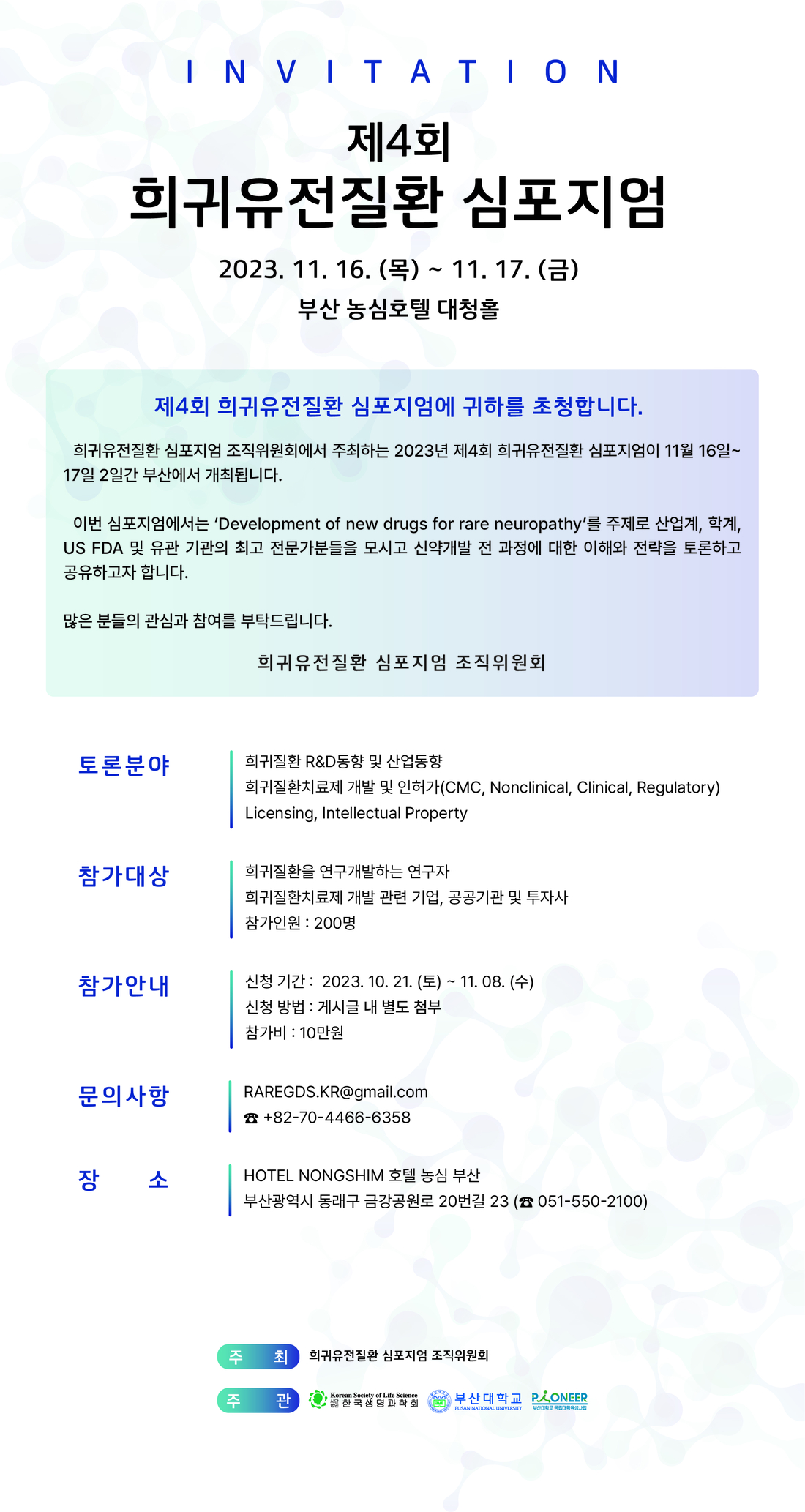 다가오는 11월16일(목)~17일(금), 호텔 농심 부산에서 개최되는 제4회 희귀유전질환 심포지엄에서는 ‘Development of new drugs for Rare neuropathy’를 주제로 산업계, 학계, US FDA 및 유관 기관의 최고 전문가분들을 모시고 신약개발 전 과정에 대한 이해와 전략을 토론하고 공유하고자 합니다.