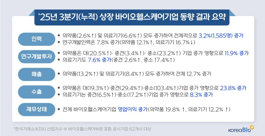 한국바이오협회, ‘25년 3분기 상장 바이오헬스케어기업 동향조사 결과발표... 상장 바이오헬스기업 ‘25년 3분기 안정적 성장 흐름 유지