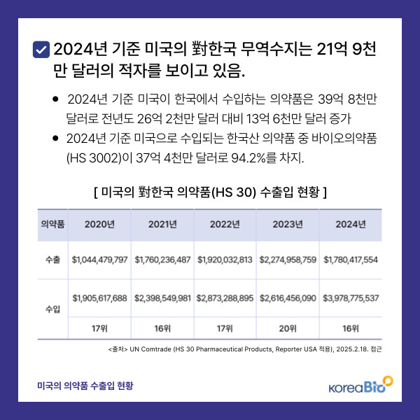 □ UN 무역통계데이터(UN COMTRADE)에 따르면, 2024년 기준 미국은 의약품 943억 달러를 수출하고 2,126억 달러를 수입해 1,180억 달러의 무역수지 적자를 기록함.