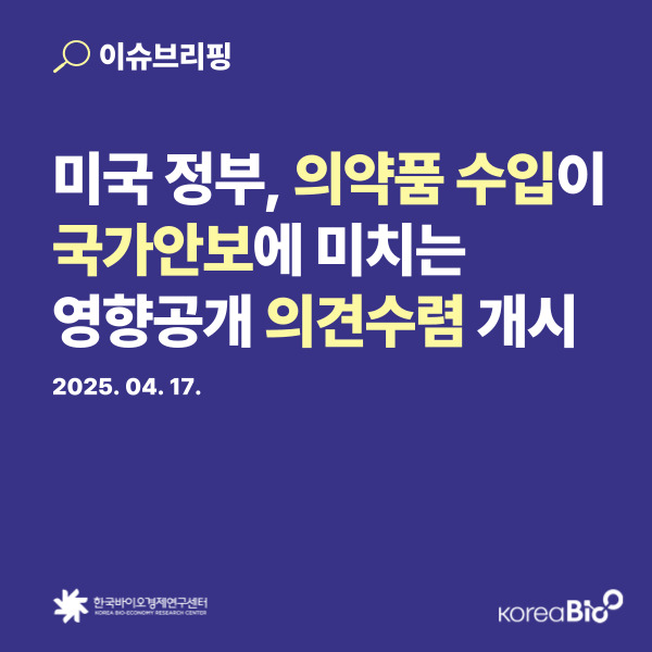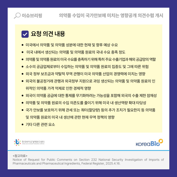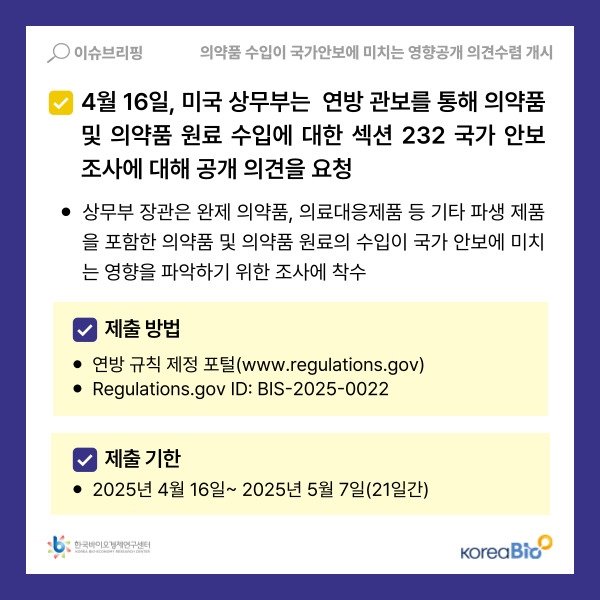 □ 4월 16일, 미국 상무부는 연방 관보(Federal Register)를 통해 의약품 및 의약품 원료 수입에 대한 섹션 232 국가 안보 조사에 대해 공개 의견을 요청함.