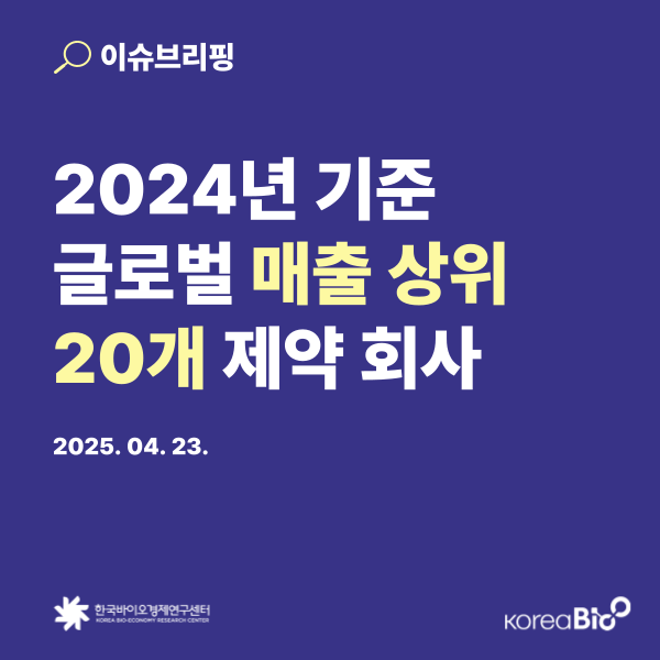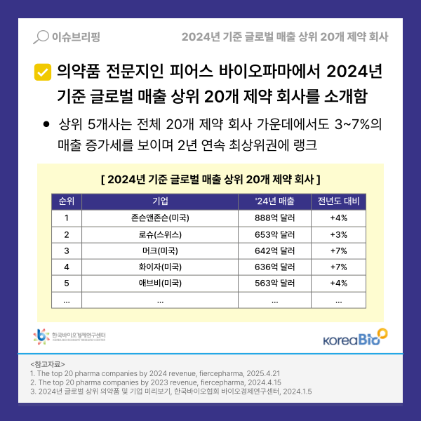 - 2024년 매출 상위 기업은 △1위 J&J △2위 로슈 △3위 머크 △4위 화이자 △5위 애브비 등으로 이들 상위 5개사는 전체 20개 제약 회사 가운데에서도 2024년 3%에서 7% 사이의 완만한 매출 증가세를 보이며 2년 연속 최상위권에 랭크됨.