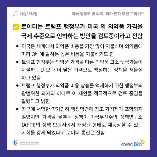 □ 로이터는 글로벌 제약업계에 있는 두 명의 소식통을 인용해 트럼프 행정부가 미국의 의약품 가격을 국제 수준으로 인하하는 방안을 검토중이라고 전했음.