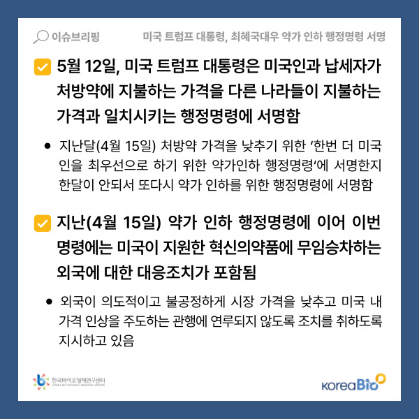 - 지난달(4월 15일) 처방약 가격을 낮추기 위한 ‘한번 더 미국인을 최우선으로 하기 위한 약가인하 행정명령‘에 서명한지 한달이 안되서 또다시 약가 인하를 위한 행정명령에 서명함.