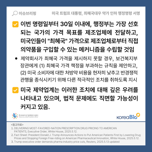 - 또한, 이번 명령일부터 30일 이내에 행정부는 가장 선호되는 국가의 가격 목표를 제조업체에 전달하고, 미국 환자들이 중개인(middlemen)을 거치지 않고 미국인들에게 "최혜국" 가격으로 의약품을 판매하는 제조업체로부터 직접 의약품을 구입할 수 있는 메커니즘을 수립할 것임.