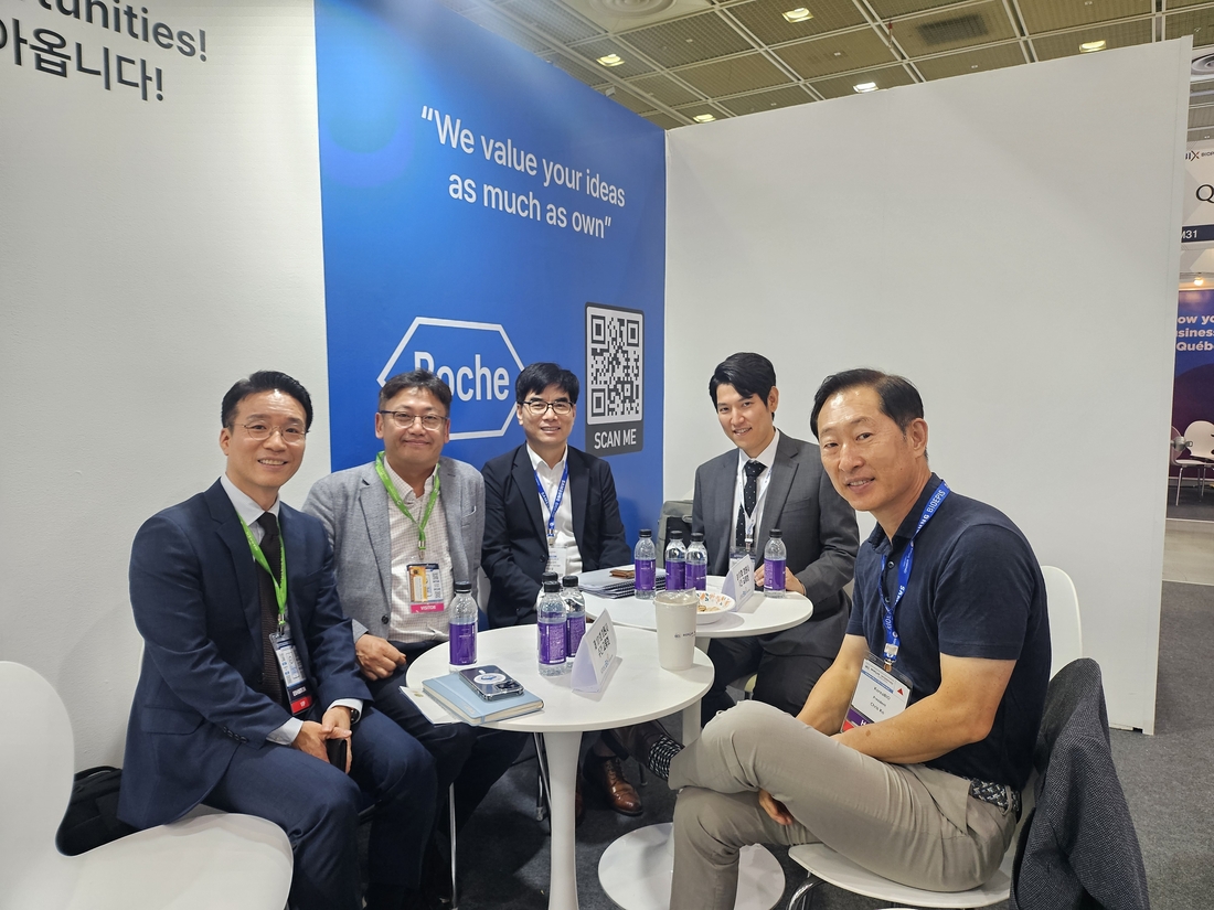 휴사이언스 조권 대표, 큐라클 최재진 상무, 카네카코리아 이순길 상무, 아크로바이오 조용찬 총괄이사, 한국바이오협회 고한승 회장