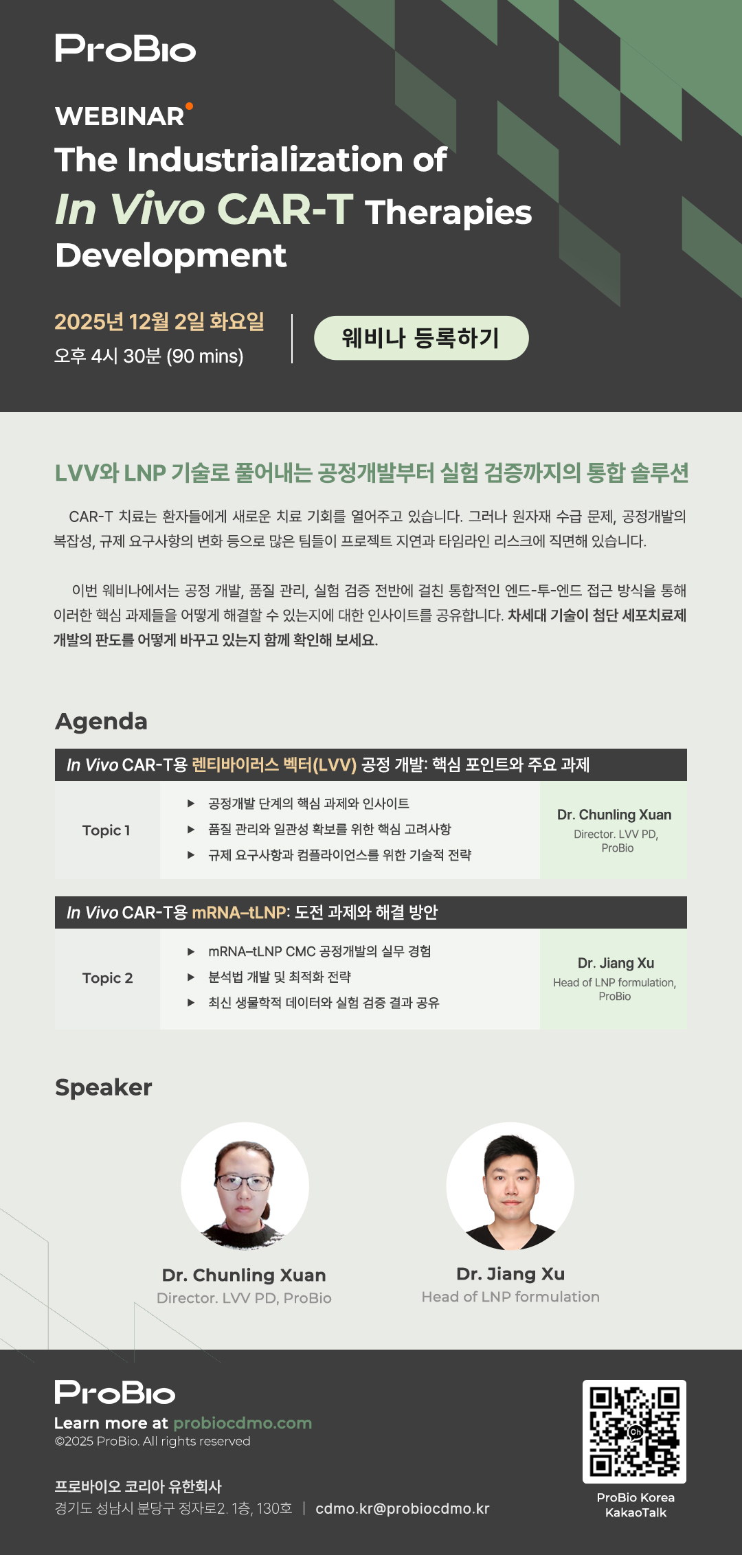 프로바이오, in Vivo CAR-T 공정개발, 품질관리, 규제 전략 인사이트 웨비나