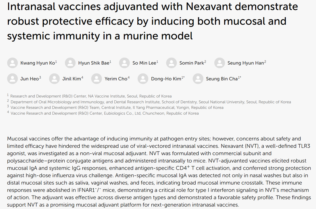 엔에이백신연구소는 자사가 개발한 점막 면역증강제 ‘넥사번트(Nexavant)’를 활용한 비강 점막 면역 연구 결과가 2026년 1월 12일자 백신 분야 SCI급 국제 학술지 Frontiers in Immunology에 게재됐다고 밝혔다.
