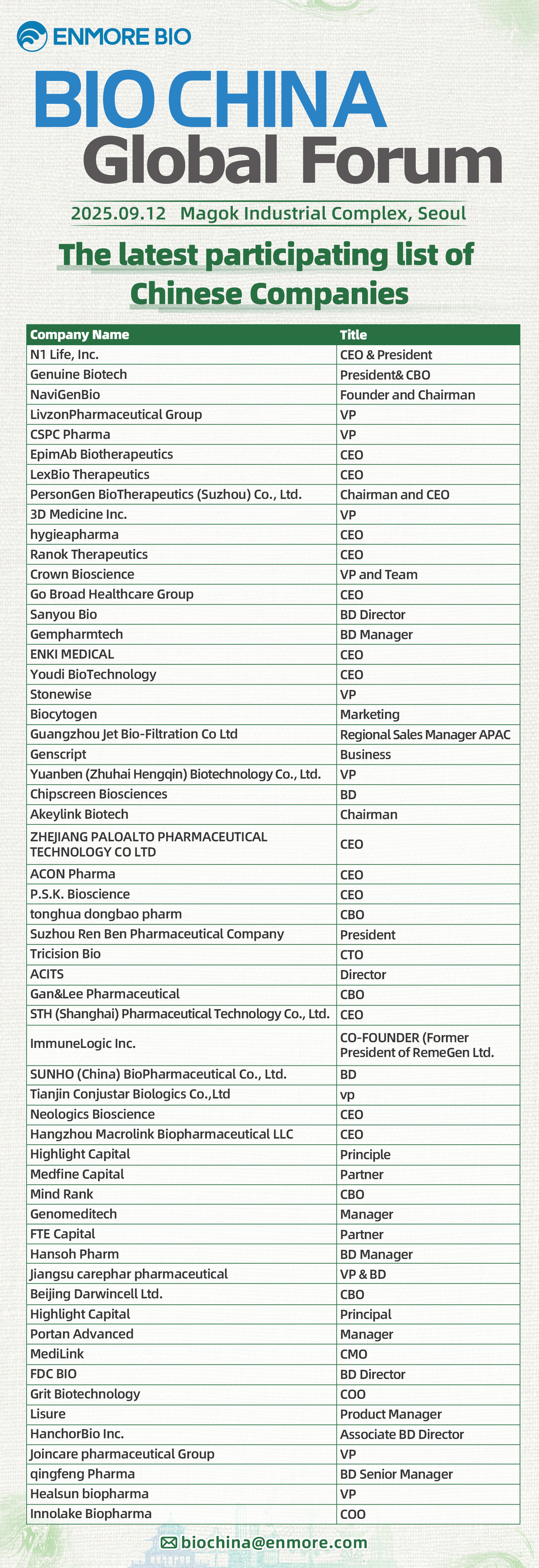 ENMORE BIO에서 주최하는 BIOCHINA 글로벌 포럼이 오는 9월 서울에서 개최됩니다.