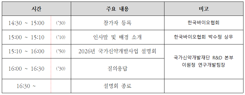 ㅇ (목적) 2026년도 신약 개발 과제 소개 및 지원 방법 안내 등 관련 정보 제공