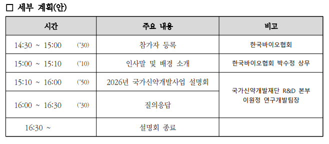 ㅇ (내용) 국가신약개발재단 담당자 설명 및 질의응답ㅇ (세부 일정)