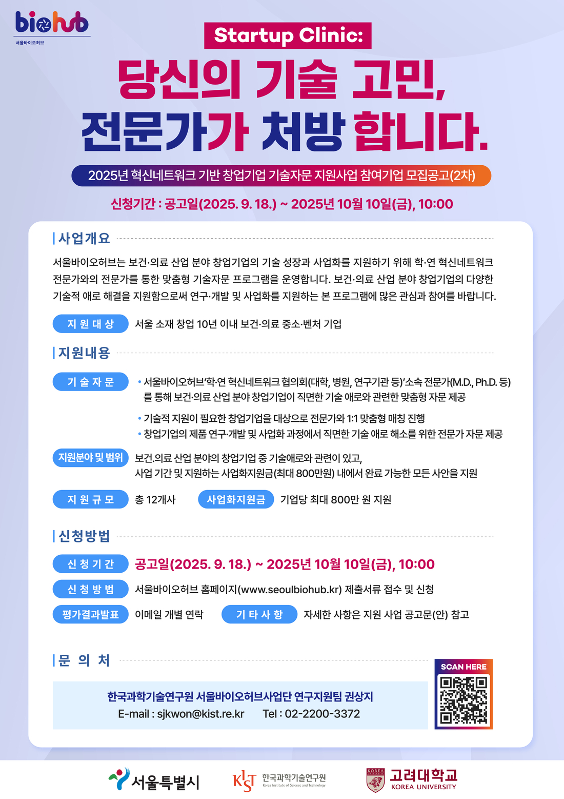 서울바이오허브에서 「2025년 혁신네트워크 기반 창업기업 기술자문 지원」 사업을 진행합니다.