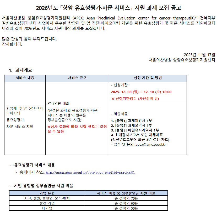 [서울아산병원 항암유효성평가지원센터] 2026년도 '항암 유효성평가∙자문 서비스' 지원 과제 모집 공고