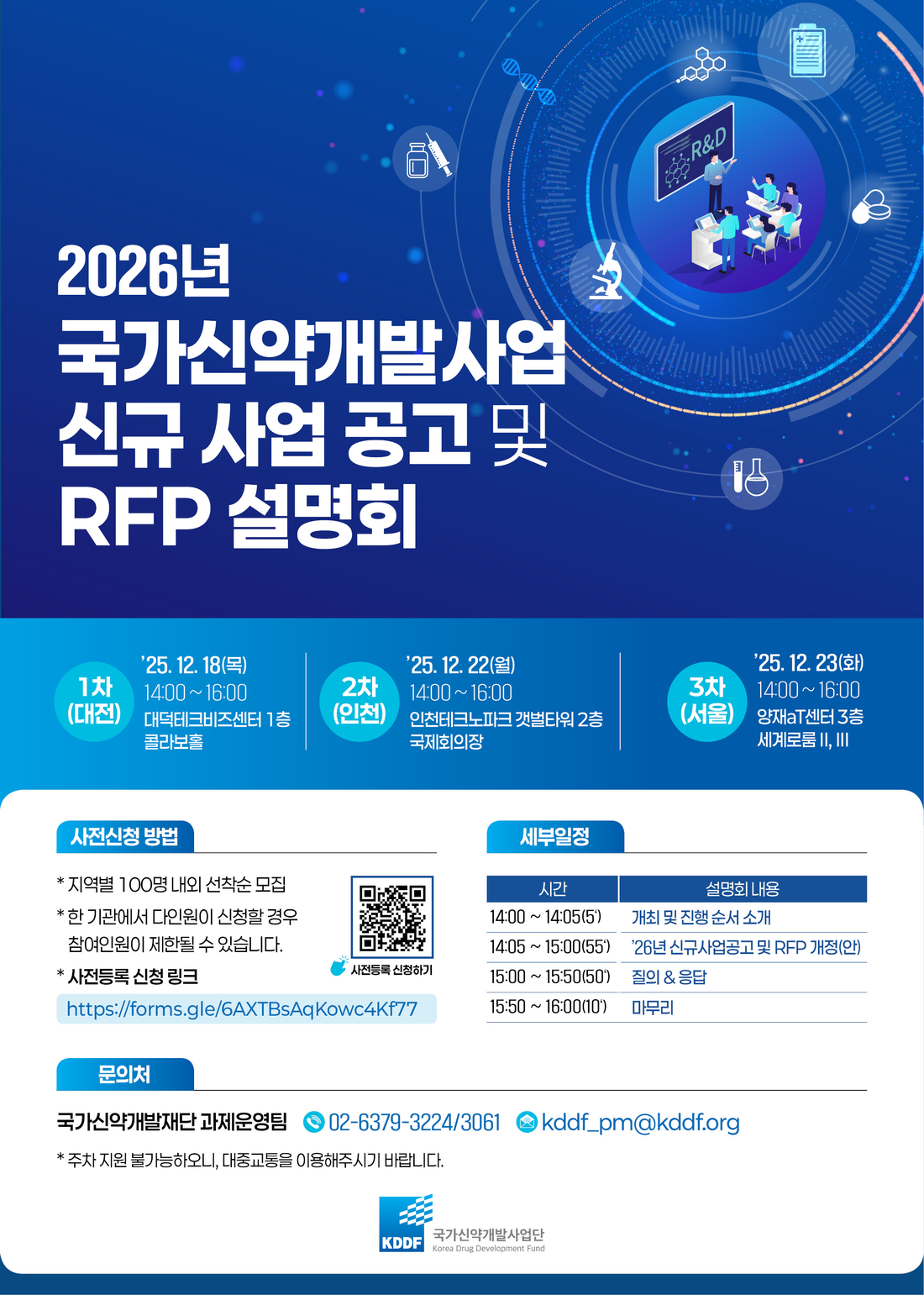 국가신약개발재단에서 「2026년 1차 국가신약개발사업 신규 사업 공고 및 RFP 설명회」를 개최합니다.