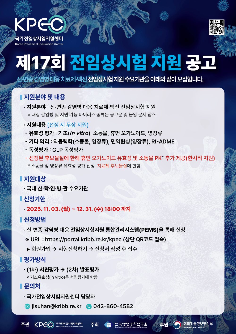 [국가전임상시험지원센터] 2025년 제17회 감염병 대응 전임상시험 지원 공고 안내