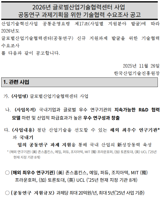 [KIAT] 2026년 글로벌산업기술협력센터 사업 공동연구 기술협력 수요조사 공고