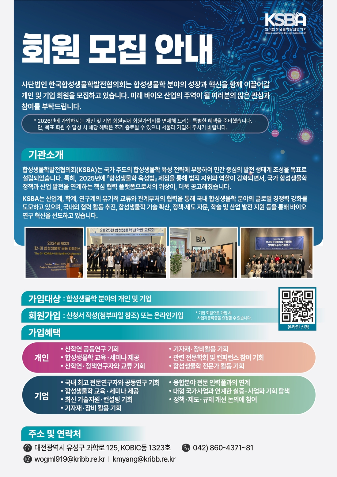 2026년 한국합성생물학발전협의회에서는 개인 및 기관회원 모집을 홍보하고 있으며 많은 관심과 참여를 부탁드립니다.