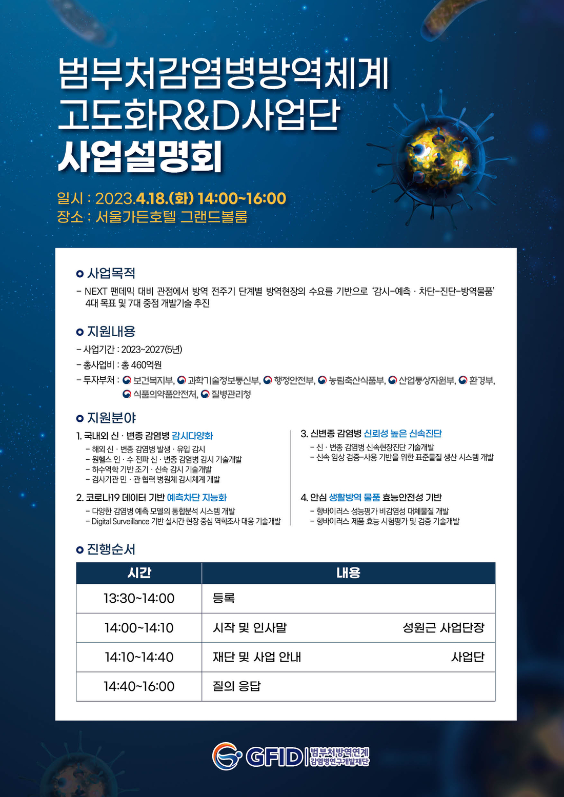 2023년 범부처감염병방역체계고도화R&D사업 신규과제에 대한 사업설명회를 다음과 같이 개최하오니 많은 참석 바랍니다.