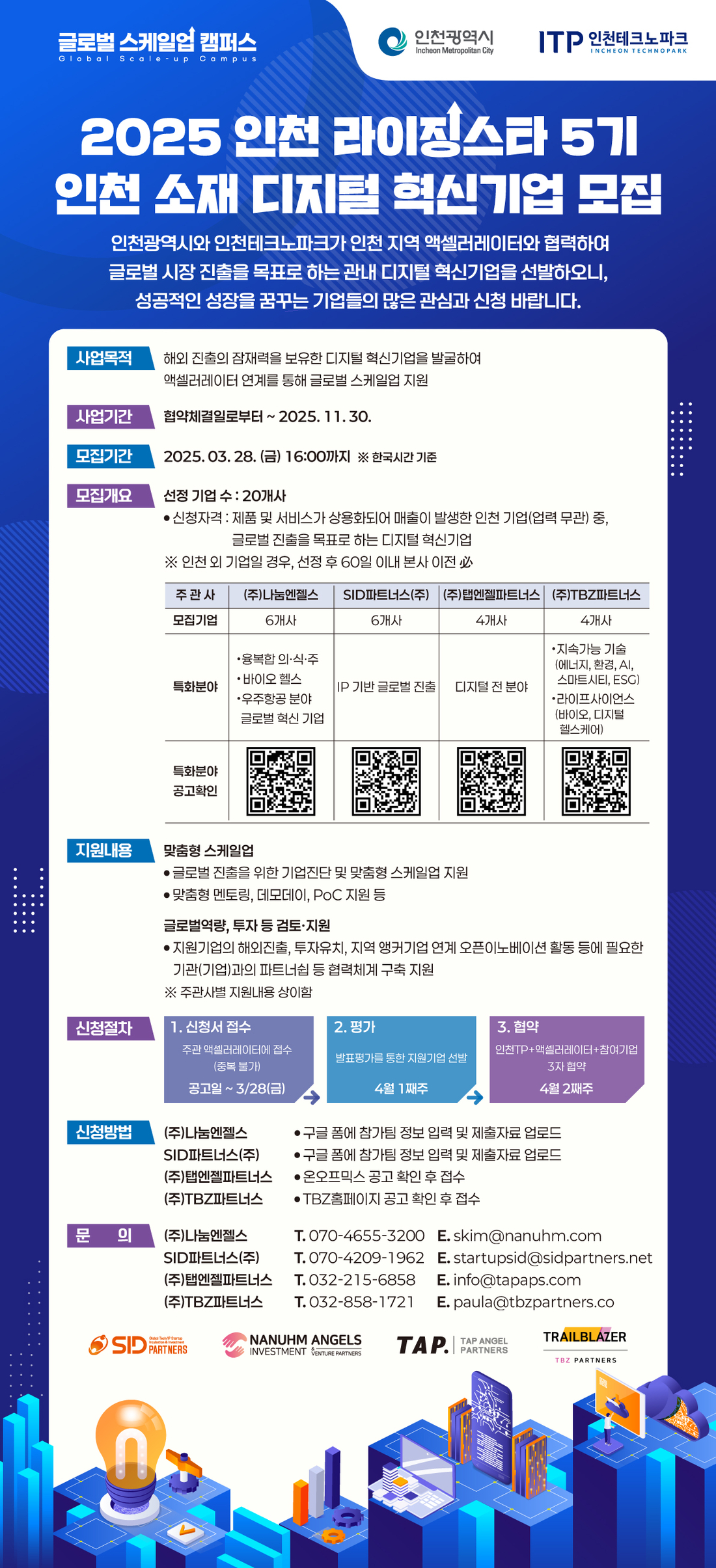 인천광역시와 인천테크노파크가 인천 지역 액셀러레이터와 협력하여 글로벌 시장 진출을 목표로 하는 관내 디지털 혁신기업을 선발하오니,
