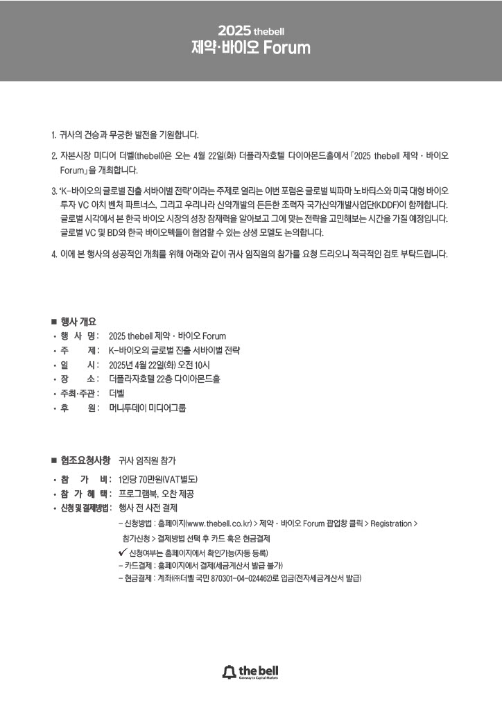 더벨 제약바이오부가 4월 22일 오전 10시 더플라자호텔 22층 다이아몬드홀에서 「2025 thebell 제약·바이오 Forum」을 진행합니다.
