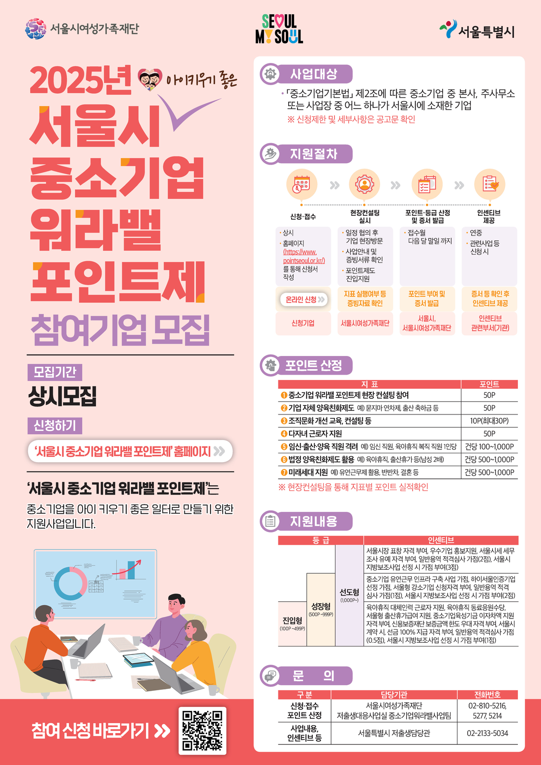 - 신청·접수 포인트 산정 : 서울시여성가족재단 저출생대응사업실 중소기업워라밸사업팀 (02-810-5216, 5277, 5214)