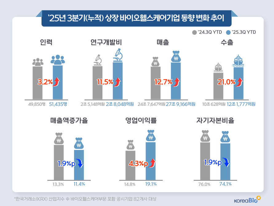 한국바이오협회, ‘25년 3분기 상장 바이오헬스케어기업 동향조사 결과발표... 상장 바이오헬스기업 ‘25년 3분기 안정적 성장 흐름 유지